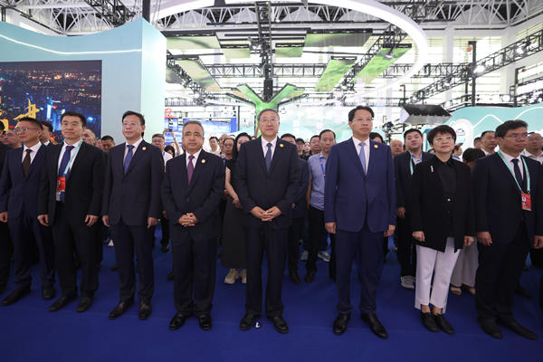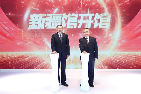 12時30分,李邑飛、艾爾肯·吐尼亞孜共同啟動激光柱,為新疆館開館,并和與會嘉賓參觀展廳,近距離感受新疆在經貿、科技、文旅等領域取得的豐碩成果。