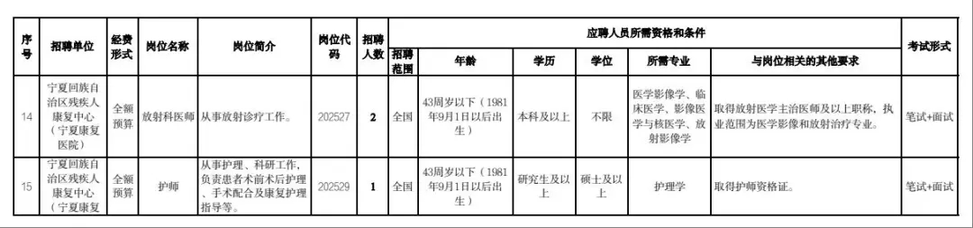 《寧夏回族自治區(qū)殘疾人康復(fù)中心(寧夏康復(fù)醫(yī)院)2025年自主公開招聘事業(yè)單位工作人員公告》已于2025年9月26日發(fā)布。因部分崗位報(bào)名審核通過(guò)人數(shù)未達(dá)到開考比例或無(wú)人報(bào)考,經(jīng)自治區(qū)殘聯(lián)自主公開招聘事業(yè)單位工作人員領(lǐng)導(dǎo)小組研究,現(xiàn)對(duì)部分崗位(崗位代碼:202501、202503、202504、202507、202510、202513、202414、202516、202517、202519、202521、202523、202525、202527、202529)年齡、學(xué)歷等資格條件進(jìn)行調(diào)整(具體情況詳見附件1),報(bào)名時(shí)間進(jìn)行延長(zhǎng):