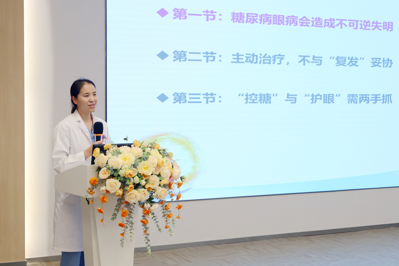 本次活動以“眼底一張照,眼病早知道”為主題,聚焦糖尿病視網膜病變(簡稱“糖網”)這一高發并發癥。活動中,眼科醫生師翠艷通過臨床解析、圖文并茂的直觀演示,詳細講述了糖尿病對眼部健康的“隱形威脅”:從早期視力模糊、視物變形,到晚期視網膜脫離甚至失明,進展往往悄無聲息,而長期忽視眼健康檢查,正是導致病情惡化的關鍵誘因。