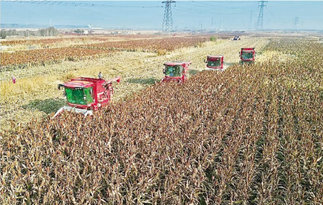 大型收割機(jī)在田間作業(yè),高效完成高粱收割、脫粒等工序。記者 桑娜 攝