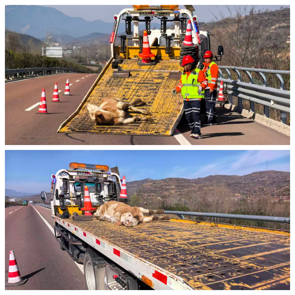 到達(dá)現(xiàn)場(chǎng)后,民警立即啟動(dòng)應(yīng)急預(yù)案,在來(lái)車(chē)方向設(shè)置警示標(biāo)志,并對(duì)影響通行路段進(jìn)行臨時(shí)半封閉交通管制。隨后聯(lián)合清障救援部門(mén)和道路養(yǎng)護(hù)部門(mén),采用繩索套縛的方式控制受驚的小牛,避免其闖入快車(chē)道。最終將小牛快速轉(zhuǎn)運(yùn)至清障車(chē)上,轉(zhuǎn)移至安全場(chǎng)所。