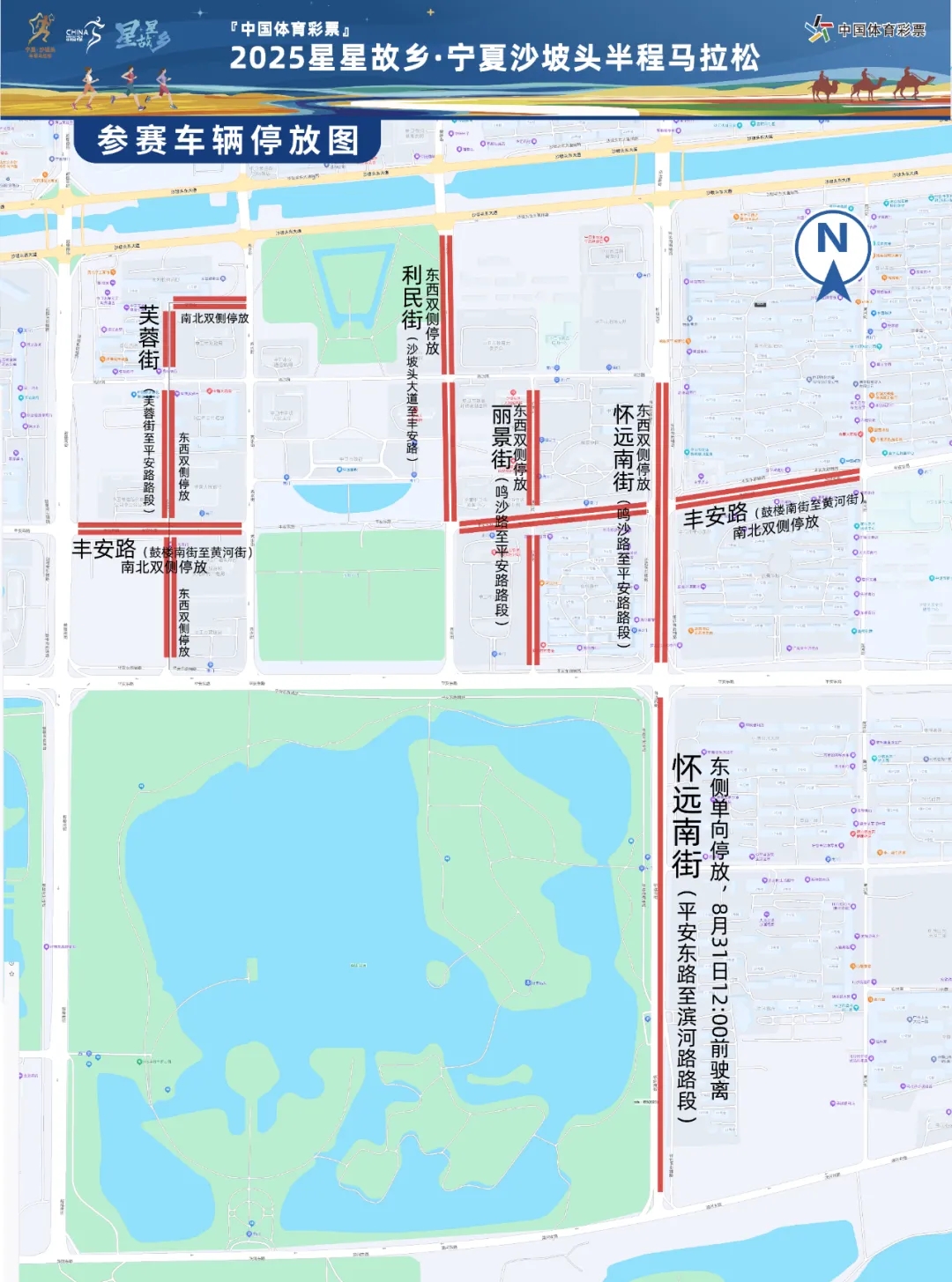 為保障賽事周邊路段安全有序暢通,針對參賽車輛臨時增設6處停車區域,臨時停車時限:8月31日5時30分至比賽結束,具體點位如下: