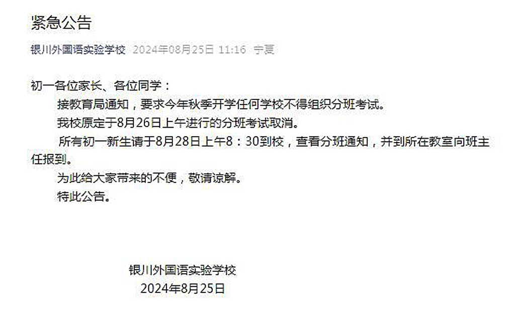 銀川外國語實驗學校初一新生分班考試被緊急叫停